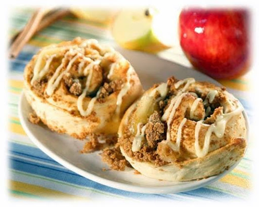 Spray counter lightly with non-stick cooking spray. Roll dough into a 12x18-inch rectangle. Spread apple pie filling evenly over dough leaving 1/2-inch around all edges. Sprinkle crumbled spice cake on top of pie filling. Starting with a long side, roll up jelly roll style. Place seam side down. With a sharp serrated knife cut into 12 slices. Place on a large sprayed baking sheet and cover with sprayed plastic wrap. Let rise until double in size. Remove wrap and bake at 350°F 25-30 minutes or until golden brown. Combine icing ingredients and mix well. Drizzle over cooled rolls.