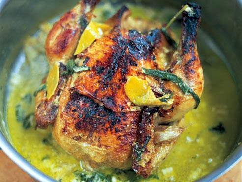 Put your chicken back in the pot with the rest of the ingredients, and cook in the preheated oven for 1½ hours. Baste with the cooking juice when you remember. The lemon zest will sort of split the milk, making a sauce which is absolutely fantastic.
