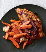 2. In a 9-by-13-inch baking pan, toss the carrots and 12 cloves garlic with 1/4 cup of the lemon-chili mixture. Place the pan in a cold oven and heat to 400°.
