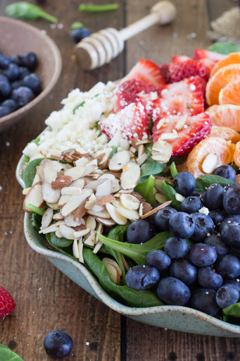 Meanwhile, combine all of the dressing ingredients into an airtight jar. Shake until well combined. Toss the dressing with the spinach. Add in the fruit and feta cheese and toss again. If desired squeeze some fresh lemon over the salad. Just about a teaspoon.
