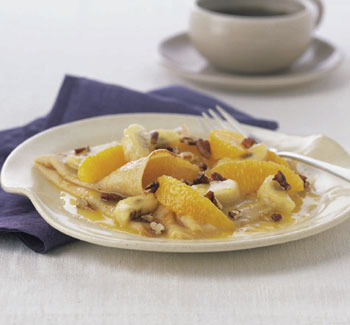 Add orange segments and banana to skillet and cook, shaking skillet occasionally, until fruit is heated through, about 2 minutes. Add Grand Marnier or Cognac (if using) and cook, stirring, 1 minute. Spoon fruit over crêpes and sprinkle with pecans.