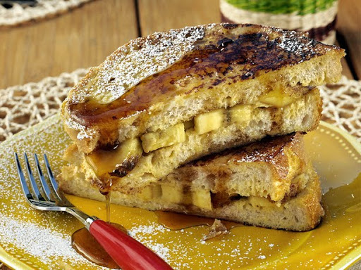 Remove a piece of bread from the egg mixture, allowing the excess to drip off. Place on a cutting board, top with four or five banana slices, then cover with another piece of bread. Brush the skillet on the grill lightly with vegetable oil. Add the sandwich to the pan; place a grill press or heavy pan over the sandwich to weigh it down. Cook until the bread is nicely toasted and golden, 3 to 4 minutes. Flip, press and cook on the other side until golden. Keep warm; repeat with the remaining bread and bananas, adding more oil as needed. Transfer the panini to plates and slice in half diagonally; top with confectioners' sugar and plenty of maple syrup.