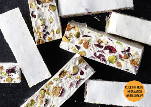 With mixer running, gradually stream hot syrup into egg whites. Beat until meringue is thick, has tripled in volume, and has cooled slightly, 10–12 minutes. Remove the bowl from the mixer and add cherries and pistachios to meringue; mix nougat with a rubber spatula to distribute evenly.