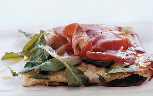 PIZZA WITH FONTINA, PROSCIUTTO, AND ARUGULA