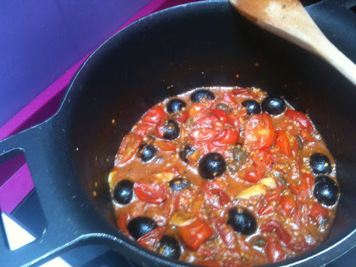 Retirar del fuego y proceder a la cocción de la pasta. Cuando la pasta este a medio cocinar, volver a colocar la sartén con la salsa a fuego mediano y agregar el orégano, las alcaparras y las aceitunas. cuando la pasta este al dente, colar y mezclar con la salsa en la sartén sobre fuego muy lento. Agregar la restante cucharada de aceite, rectificar la sal y servir de inmediato