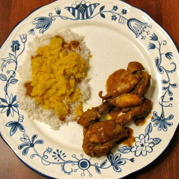 2. Put in butter and chicken. Cook at medium-high heat for 20-30 minutes. Add a bit of water so that the chicken doesn't stick to the pot.