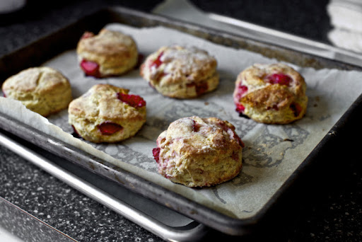 Bake the scones for 12 to 15 minutes, until bronzed at the edges and the strawberry juices are trickling out of the biscuits in places. Cool in pan for a minute, then transfer to a cooling rack. Serve warm or at room temperature.