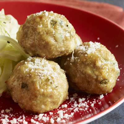 2.Place a rack on a large baking sheet. Drizzle theEVOOinto a large bowl. Add the veal and season with salt and pepper. Squeeze out the excess liquid from the bread and crumble it into the meat. Mix in the 2 cheeses, the egg, garlic, sage and nutmeg. Roll the meat into 1 1/2- to 2-inch balls. Arrange on the prepared baking sheet and roast until browned, 12 to 15 minutes.