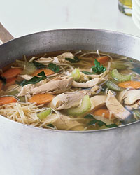 3. Add the sliced carrots and celery to the broth, cover and simmer until just tender, 12 minutes. In a saucepan of boiling salted water, cook the noodles; drain and cool under running water. Add the noodles, chicken and parsley to the pot and bring to a simmer. Ladle the soup into bowls and serve hot.