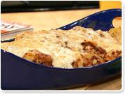 Toss the pasta with the meat sauce and arrange in a casserole. Pour the béchamel sauce over the top in an even layer. Top with a layer of parmigiano-reggiano and broil in the oven to brown the top.