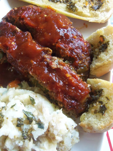 5. Warm up barbeque sauce. Serve the meatloaf slices covered in barbeque sauce with a side a mashed potatoes and fresh corn!