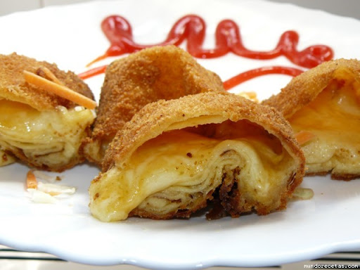 Rellenamos cada crepe con el queso gruyere, el queso parmesano y una pizca de hierbas de Provenza mezclados y enrollamos. Rebozamos las creps en harina, huevo batido pan rallado y las freimos en una sartén con abundante aceite caliente. Escurrimos en papel de cocina absorbente y servimos.