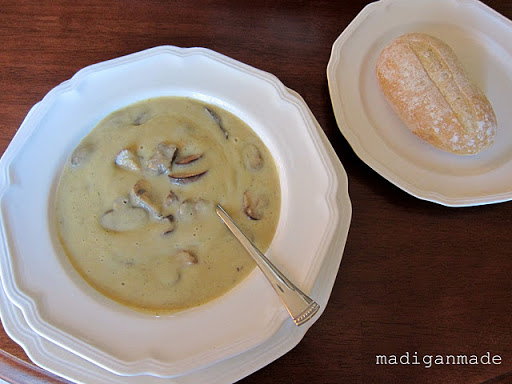 Cook: While the soup cooks, heat 1 tbsp butter and 1 tbsp olive oil in a skillet. Saute the mushrooms until brown and tender. (tip: use a really large skillet or saute in two batches to give the mushrooms some room to brown)