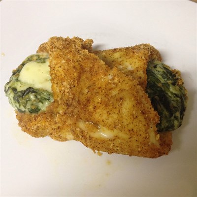Place a spoonful of the spinach dip in the middle of each chicken breast. Fold the ends up and use a toothpick to hold them in place. (Feel free to roll the finished product in the almond flour/Cajun seasoning mixture again at this time.)
