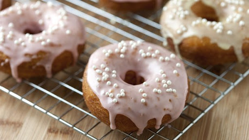 Dip 4 doughnuts in pink glaze and 4 in yellow glaze. Return to cooling rack. Immediately top with sprinkles. Let glaze dry 2 to 3 minutes before serving.