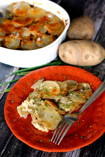 Repeat layers until all potato slices are used or casserole is full, ending with layer of potato slices. Season top layer of potatoes with salt and pepper and remaining cheese.