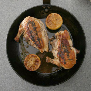 2. Heat oven to 475˚. Heat oil in a 12" ovenproof skillet over medium-high heat. Add chicken breasts, skin side down and brown, 6–8 minutes. Transfer skillet to oven and roast for 18 minutes. Flip breasts and cook until skin crisps, about 5 minutes. Transfer breasts to 4 plates; remove and discard twine. Place skillet over high heat; add lemons, cut side down. Cook until browned, 3 minutes. Add broth and reduce by half. Serve chicken, garnished with sauce and lemon.