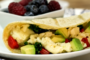 Halve eggs, placing a portion on each tortilla; top each with a portion of kale, roasted pepper and diced avocado and squeeze with a little more lemon juice. Fold and serve.