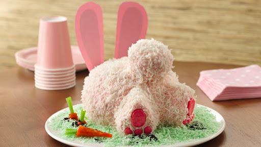 Spoon frosting into large bowl. Add red food color to make desired pink color. Place bowl cake on tray cut side down; spread 1/3 cup frosting over cake. Use frosting to adhere cupcakes to bowl cake for feet and bunny tail. Use toothpicks if necessary. Place marshmallow halves, cut sides down, on tops of 2 cupcakes to make heels of feet. Spread thin layer of frosting over side and top of cake to seal in crumbs. Freeze cake 30 to 45 minutes to set frosting.