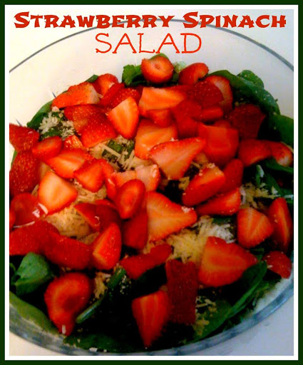 Next layer spinach, green onions sliced, Parmesan cheese, and sliced strawberries in a pretty salad bowl.