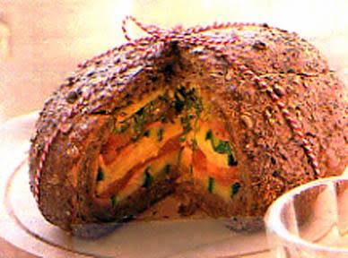 Een flinke kap van 1 grote bruine broodbol afsnijden en bet brood uithollen, rondom een rand van ± 2 cm dik laten staan. Het kruim dat overblijft, wordt niet gebruikt. De binnenkant van bet brood met 3 eetlepels olijf- of pizzaolie besprenkelen. Een courgette in plak- ken snijden en deze in 2 eetlepels kruidenboter bakken tot ze zacht zijn, 400 g tomaten in plakken snijden. Het brood vullen met lagen courgette, 200 g iets dikker gesneden achterham, tomaat en 200 g pittig belegen kaas in plakjes, tot alles op is. Van 2 eetlepels olijfolie, 1 eetlepel witte wijnazijn, versgemalen peper en zout naar smaak en 1 theelepel mosterd een dressing kloppen, ± 15 met ansjovis gevulde olijven in plakjes snijden en samen met 1 eetlepel gemengde tuinkruiden door de dressing scheppen. In de broodbol schenken en de kap er weer opzetten. De bol met keukentouw