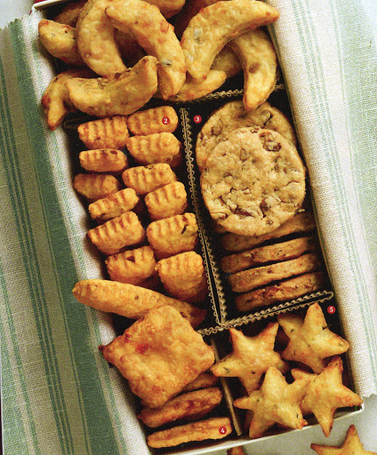 Olive-Blue Moons;Bacon-Smoked paprika Cheddar Bars; Pecan-Rosemary-Cheddar Buttons, Pimiento Cheese Squares; Parmesan-Basil Cheddar stars.