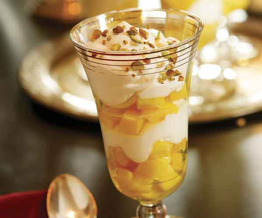 Using a slotted spoon, divide about half of the mango cubes among six parfait glasses. Divide half the yogurt mixture among the glasses, layering it on top of the mango. Drizzle about 1 tsp. of the mango-cardamom syrup into each glass. Repeat the layering with the remaining mango and yogurt. Finish with another drizzle of syrup, sprinkle with the pistachios, and serve.