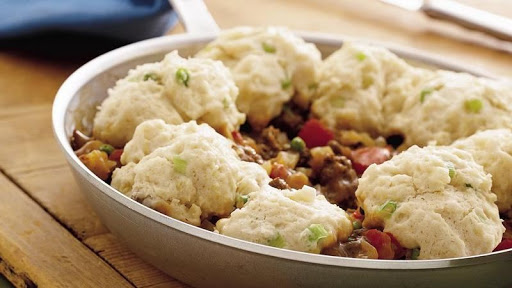 2. In small bowl, stir Bisquick mix, remaining 2 tablespoons onions and 1/2 cup water until soft dough forms. Drop dough by tablespoonfuls (see Success tip) onto beef mixture.