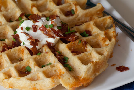 Top waffles with sour cream, chives, and crumbled prosciutto.