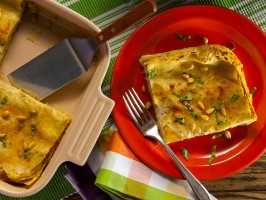 Allow the lasagna to sit for 15 minutes before topping with the roasted pine nuts and chiffonade of basil. Slice and serve.