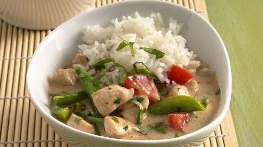 Pour coconut milk over chicken. Stir in brown sugar, salt, soy sauce, pea pods and bell pepper. Reduce heat to medium. Simmer uncovered 3 to 5 minutes, stirring occasionally, until vegetables are crisp-tender. Stir into tomato.