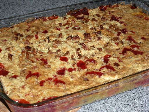Dump undrained pineapple into a 9x13 baking dish and spread evenly. Using a spoon, dump globs of cherry pie filling evenly on top and spread it out. Sprinkle on dry cake mix to cover fruit; top with nuts.