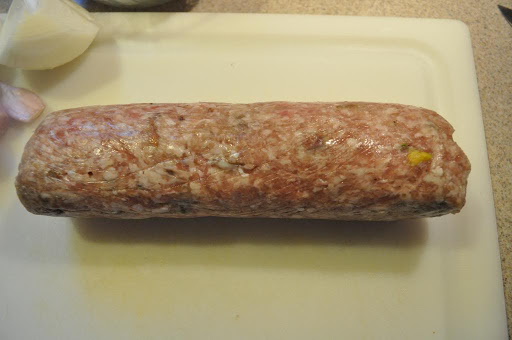 Melt the butter in a large saucepan. Unroll the sausage from the plastic wrap very carefully, so as not to break it, and place in the saucepan. Brown on all sides over low heat, turning if gently, for 6 to 8 minutes.