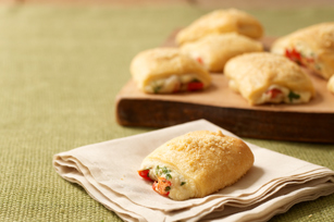 SEPARATE dough into 8 rectangles; seal seams. Spread with cream cheese mixture; top with peppers and parsley. Fold each rectangle lengthwise into thirds to enclose filling; cut into 4 squares. Place, seam-sides down, on baking sheet; top with remaining Parmesan.