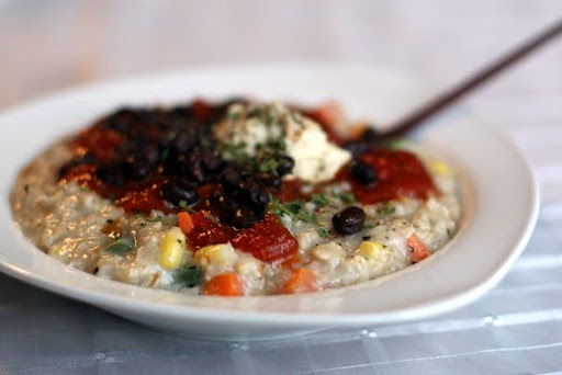 Put oats and water in a pot on medium heat and stir frequently for 5 mins. Add frozen veggies directly into pot, black pepper, sea salt, garlic. Cook for about 7-8 more minutes on low-medium heat, stirring often. Pour into bowl and add toppings