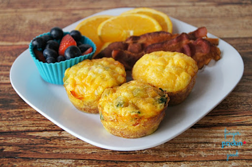 Whisk together 8 eggs and 1/4 cup milk with a fork. Pour your egg mixture in each tin. Then sprinkle a little cheddar cheese on top of each cup.