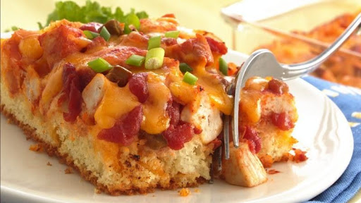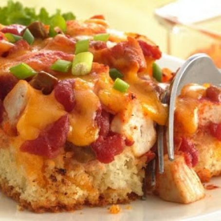 Cook chicken in oil in 10-inch skillet over medium-high heat, stirring frequently, until outsides turn white; drain. Stir in salsa; heat until hot. Spoon over batter in pan within 1/2 inch of edges.