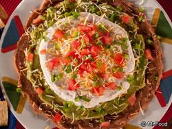 Spread refried beans over a 12-inch round serving platter then spread guacamole over beans.