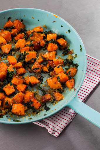 In a skillet over medium heat, warm 1 teaspoon coconut oil. Add a pinch of red pepper flakes and 1/2 cup cubed sweet potato, then saute for about 5 minutes. Stir in 1/3 cup chopped kale, 1 clove minced garlic, and a pinch of salt. Saute until kale has wilted, about 3 minutes. Add 1/2 cup cooked quinoa and heat through.