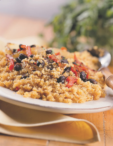 Fluff the quinoa with a fork and stir in the cilantro. Place in a serving bowl and top with the pepper mixture.