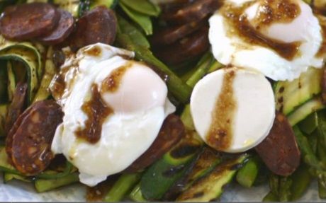 Heat a griddle pan until hot. Grill zucchini slices and sausage slices until you get nice grill marks. Set aside.