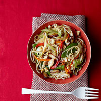 Turn the heat under the skillet back to high. When the onions sizzle, add the soy sauce, sherry and sesame oil and let the mixture bubble for a few seconds. Add the noodles and vegetables; toss well. Cook, stirring often, until the mushrooms are fully cooked and the peppers are tender but still slightly crunchy, about 3 minutes.