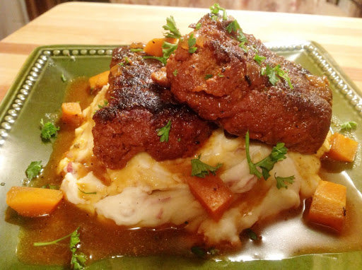 Turn off the heat and add the broth to the pot. Carefully return the seitan ribs to the pot and make sure they are covered by liquid. Cover the pot and place it in the oven. Cook for 1 hour or until the seitan ribs have considerably softened but are not falling apart. While the ribs are cooking, prepare any side dishes you are having. These seitan ribs are wonderful over whipped mashed potatoes or polenta.