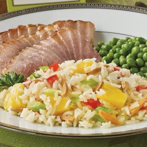 To make Pineapple Ham Rice, prepare recipe as directed above, except stir in 1 cup diced cooked ham when adding pineapple to rice.