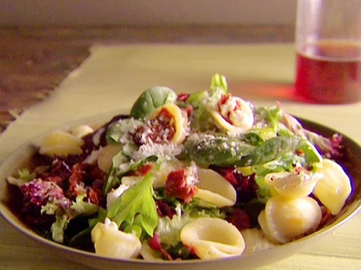 In medium bowl, mix the salad greens with the sun-dried tomatoes, goat cheese, and Parmesan. Top with warm pasta and 1/2 cup of the reserved pasta water. Toss to combine and wilt the greens. Season with a pinch each of salt and pepper, or to taste. Garnish with additional Parmesan, if desired, and serve.
