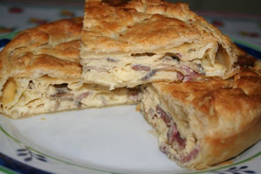 1 Directions for making and using the yeast dough crust: In a cup, mix yeast and warm water together. 2 Place flour on a pastry board, add leaf lard (or butter), salt, pepper and yeast/water mixture. 3 Work together well until dough forms, continue working the dough until it is elastic and smooth. 4 Place dough in a deep dish, cover and allow it to rise in a warm place for 2 hours, or until doubled in volume. 5 When dough has risen, cut into 2 pieces. 6 Stretch one piece to fit into a greased 9 x 2 1/2-inch round cake pan. 7 Preheat oven to 375°F. 8 Prepare filling as described below (steps #19 to #22). 9 After filling the dough lined pan, stretch second piece of dough and place over the filling, pressing the edges closed. 10 If there is a lot of excess dough left on the edge, carefully trim some, but leave enough to flute the sealed edge. 11 (I like to brush the crust with a bit of beaten egg before baking, to give it a gloss.) Directions for using a regular pie crust dough: Preheat oven to 400°F. 12 Prepare pastry and line a 10 inch pie pan. 13 Prick dough with a fork, and sprinkle with a bit of flour. 14 Prepare filling as described below (steps #19 to #22). 15 Pour mixture into pastry lined pie tin and cover with top crust. 16 Leave about a 1/2 to 3/4-inch overhang. 17 Fold dough under and back, and flute edge. 18 Cut slits in top crust to allow steam to escape. 19 Directions for making the Filling: Cut sausage into small pieces (or remove from casings and crumble), place in frying pan and brown lightly in 2 Tablespoons of water. 20 In a large bowl, combine ricotta, mozzarella, salt and pepper; add eggs one at a time, beating with a wooden spoon after each addition. 21 Add cooked sausage, prosciutto, ham, parsley and grated cheese to ricotta mixture. 22 Blend well. 23 Fill dough lined pan with mixture. 24 Directions for Baking: For Regular Pie Crust: Bake the pie for 15 minutes in preheated (400°) oven, lower oven temperature to 325°F and continue baking for 45-50 minutes more. 25 Remove from oven and let pie "settle" for about 10 minutes before slicing if you are going to serve it warm; otherwise let pie cool and refrigerate when cooled. 26 Pie can be served either warm or cold. 27 Slices can be reheated in the microwave. 28 For Yeast Dough Crust: Bake the pie in a preheated 375°F oven for 45-50 minutes. 29 Remove from oven and let pie "settle" for about 10 minutes before slicing if you are going to serve it warm; otherwise let pie cool and refrigerate when cooled. 30 Pie can be served either warm or cold. 31 Slices can be reheated in the microwave.