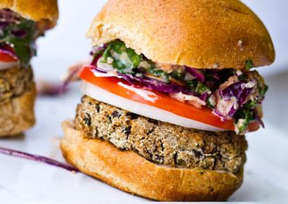TOP each bun bottom with a slice of tomato, onion, bean burger and coleslaw.