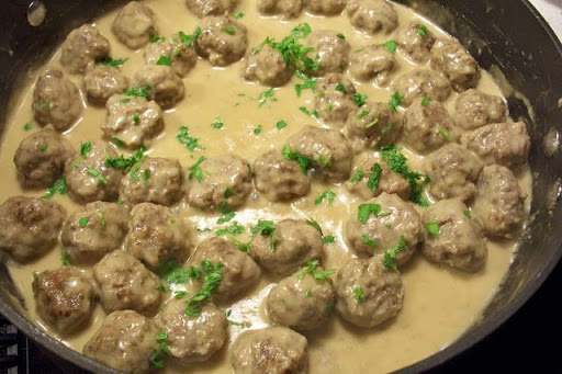 Make the meatballs: put the breadcrumbs in a large bowl. Heat the butter in a skillet over medium heat. Add the onion, garlic, allspice, 2 tsp salt, and 1/4 tsp white pepper and cook, stirring, until soft, about 5 minutes. Add the milk and Worcestershire sauce and bring to a simmer. Pour the milk mixture over the bread crumbs and stir to make a thick paste; let cool. Add the beef, pork, egg and egg white to the bowl and mix until combined.