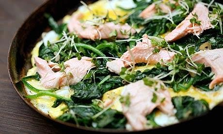 The eggs will quickly start setting. As they do, draw the outer edges of the frittata back to the middle of the pan, then tip it so that the runny egg moves to the outside. Fork on the spinach, then flake on the fish.