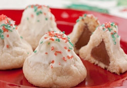 5)•Place white chocolate chips in microwave-safe bowl and microwave 60 seconds; stir until smooth. Dip top of each cookie in white chocolate and sprinkle immediately with red and green sugar. Let cool.